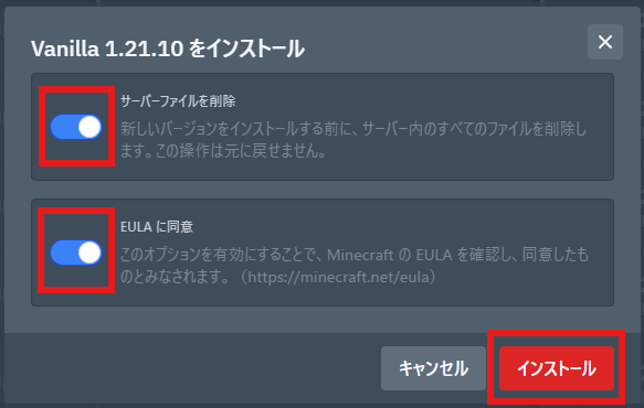 「サーバーファイルを削除」 、 「EULA に同意」 へチェックを入れ、「インストール」 を選択してください。